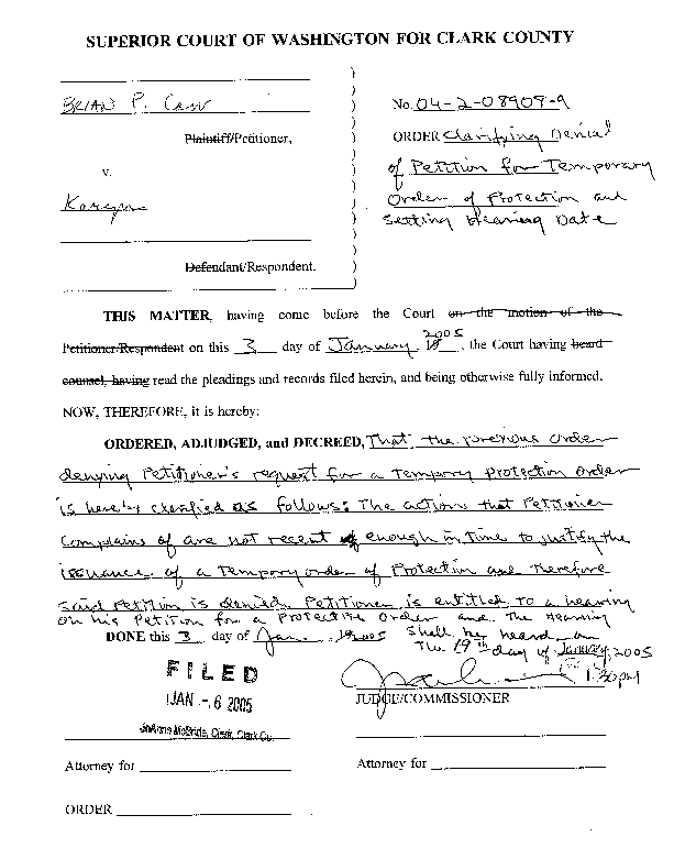 | Rich Melnick | Issued Order for Protection even though he did not have jurisdiction as shown above (was one of more three Commissioners in violation of the state constitution). The Order was issued even though the Respondent was not permitted to testify as required in STATE v. KARAS - 108 Wn. App. 692 referring to RCW 26.50. In the hearing transcript both parties were permitted to speak but no one was placed under oath so no testimony was taken (and no one could be prosecuted for perjury if they lied to the court). Issued the Order even though neither the the Petition or the allegations at the hearing contained the required allegations of physical assault, threats of physical assault (RCW 26.50.010), or behavior which would cause a reasonable to fear injury to person or propery (RCW 9A.46.110). Denied an Order without holding an ex parte hearing as required by RCW 26.50.070 (3) which must be 'in person or by telephone'.2. Further, the Petition was denied improperly as it contained the required allegations of past domestic violence in describing three cases of assault (albeit minor assaults). |