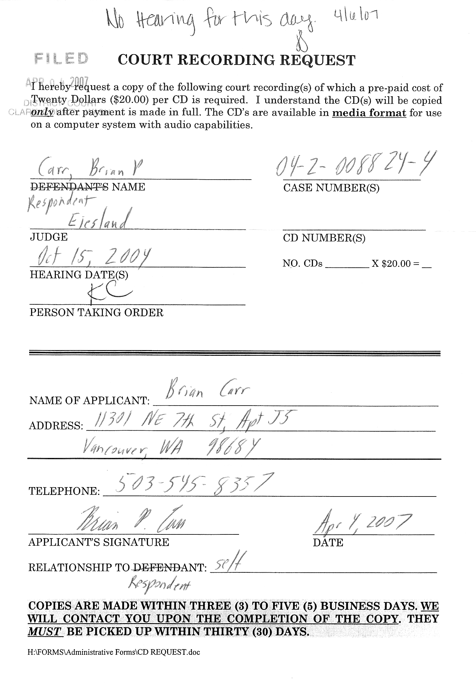 1 On April 4, 2007 I requested as copy of the Court Recording of any hearing that was held in this matter and was told by Jamie, the clerk who access the recordings, that there was no such hearing. Jamie annotated a copy of the request noting that there was no hearing on that date.