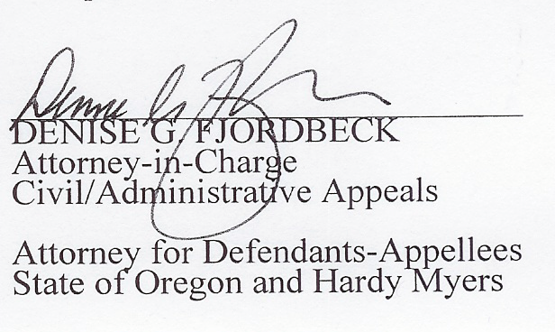 Appellees State of Oregon and Hardy Myers hereby give notice of change of counsel in the above-captioned matter. Effective November 24 , 2008, Denise G. Fjordbeck, Attorney-in-Charge, Civil/Administrative Appeals, will represent appellees State of Oregon and Hardy Myers in all further proceedings in this case. Please address all correspondence and serve any brief or other document on the undersigned.